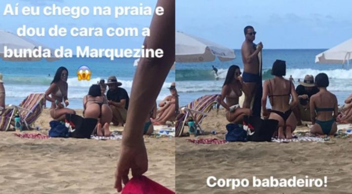 Nas primeiras imagens, a fã brincou de ser "paparazzo" e mostrou a atriz ainda de longe. "Aí eu chego na praia e dou de cara com a bunda da Marquezine", escreveu ela que, como cada uma de nós, ainda usou um emoji para demonstrar estar "chocada" com a beleza e simpatia de Bruna.