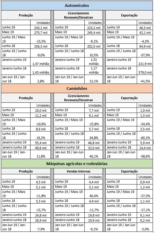 A Associação Nacional dos Fabricantes de Veículos Automotores (Anfavea) apresentou o balanço da indústria automobilística nos seis primeiros meses do ano. Para o setor de veículos, o resultado apontou para crescimento nas vendas de 12,1% e de 2,8% na produção, na comparação com o primeiro semestre de 2018.