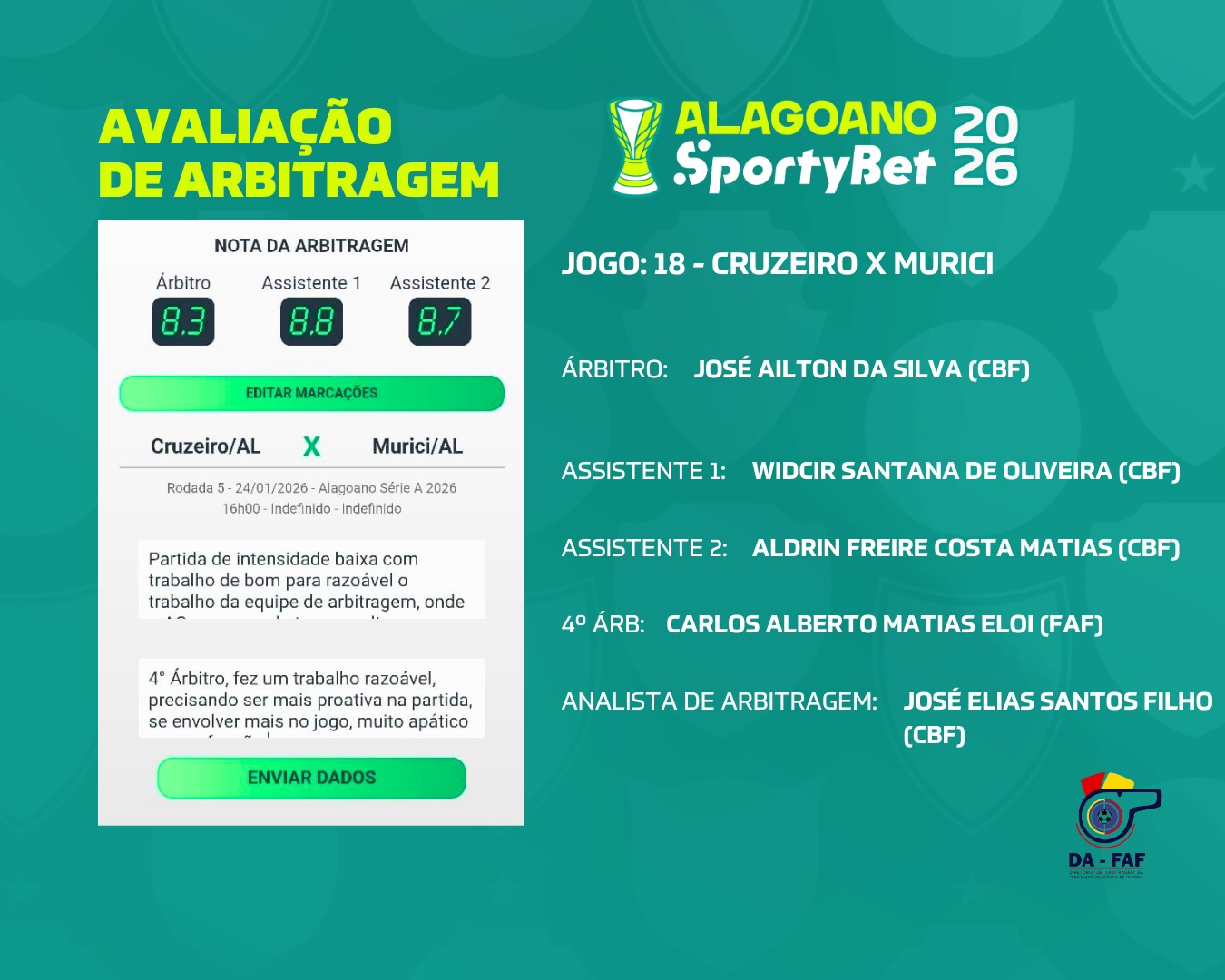 A análise da condução da arbitragem na partida entre Cruzeiro-AL e Murici, que acabou com vitória alviverde por 2 a 0, foi divulgada pela Federação no começo da tarde desta quarta-feira, 28.