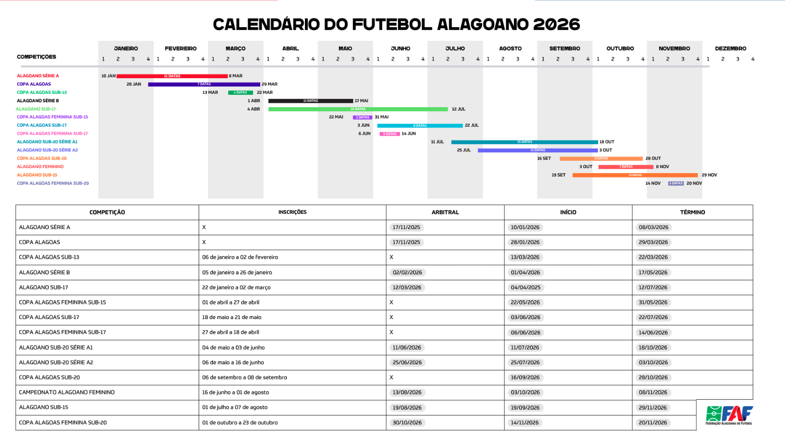 Além dos torneios profissionais, o calendário contempla disputas de base masculina e feminina, incluindo Copa Alagoas Sub-13, Sub-17, Sub-20, Alagoano Sub-15 e Sub-17, além das versões femininas nas categorias Sub-15, Sub-17 e Sub-20. Todas as datas estão distribuidas ao longo do ano, sem grandes lacunas entre as categorias. Veja abaixo: