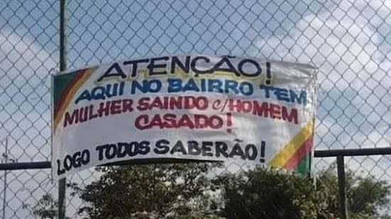 Uma foto postada no Twitter nesta segunda-feira tem chamado atenção entre os usuários do microblog. A imagem mostra uma faixa colocada numa praça de Barreiro, em Belo Horizonte, com a seguinte ameaça: "Atenção! Aqui no bairro tem mulher saindo c/ homem casado! Logo todos saberão".
