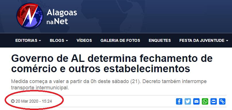 Em mais um caso de fake news que visa confundir a população alagoana, a notícia atribuída ao portal Alagoas na Net, com data de 19 de novembro de 2020, foi na verdadeveiculada originalmente no dia 20 de março de 2020 (imagem abaixo)– data da publicação do primeiro decreto governamental com medidas restritivas para enfrentamento ao novo coronavírus. Vale ressaltar que o portal Alagoas na Net não tem nenhuma ligação com a divulgação da fake news.