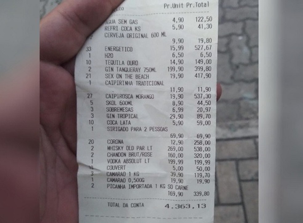 No domingo, a mesma pessoa havia entrado em um bar no Bairro Varjota, em Fortaleza, e se apresentou como jogador de futebol, pediu bebidas para vários clientes. Na nota fiscal constou um valor de R$ 4.363,13 no consumo de bebidas caras como whisky, espumantes, além de energéticos, cerveja, drinks, água e porções de picanha importada.