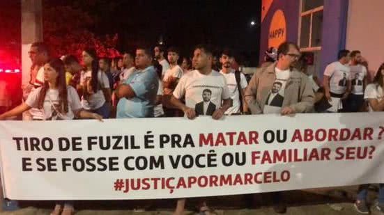 O ato aconteceu horas antes da Polícia Científica de Alagoas realizar a reprodução simulada da abordagem policial que vitimou Marcelo. "É um ato simbólico para reforçar tudo o que aconteceu, de como Marcelo foi morto. Também é um ato de protesto, um pedido de justiça. Queremos que esta reprodução esclareça o que de fato aconteceu e a maneira criminosa como Marcelo foi morto", disse um amigo do empresário, que não quis se identificar.