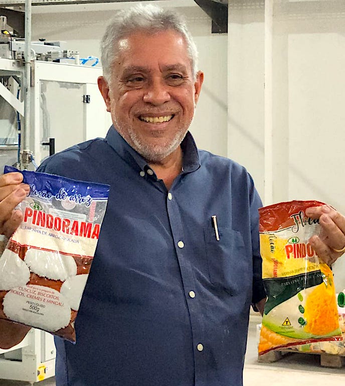Klécio, presidente da Pindorama com os mais novos produtos da Cooperativa: Flocão de arroz e milho