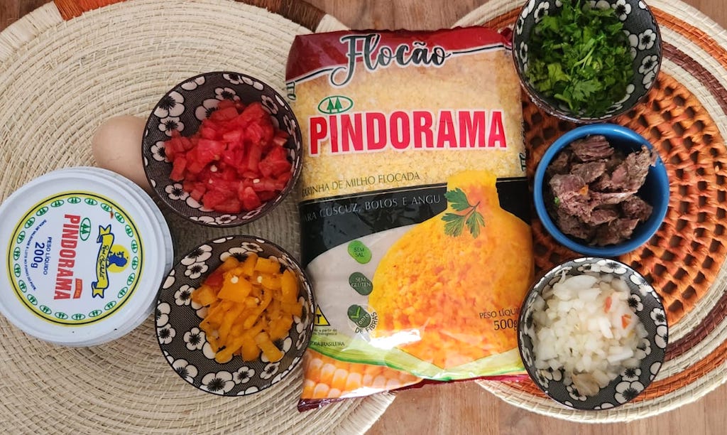 🥘 Ingredientes:1/2 Pimentão vermelho;1 Cebola;2 Tomate;5 Pimentas de cheiro;200gr Queijo coalho;Coentro a gosto1 Ovo frito;Carne (você pode usar a que preferir);1 Xícara de cuscuz Flocão Pindorama;3 colheres de sopa Manteiga Pindorama.