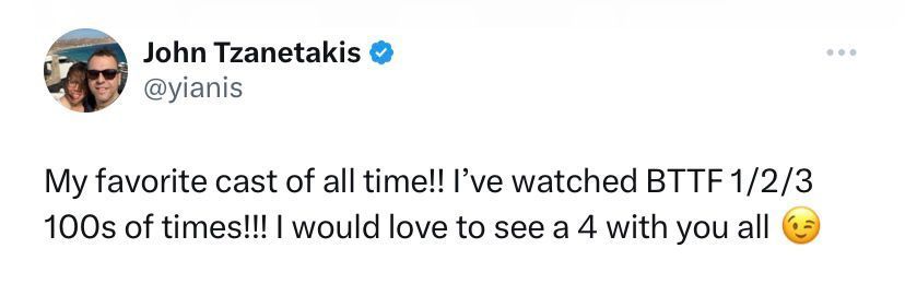 Em seu perfil no “X”, o ator Christopher Lloyd, que vive Doc Brown na obra, amenizou a saudade com um registro do encontro histórico ao lado de Michael J. Fox (Marty McFly), Lea Thompson (Lorraine, mãe de Marty) e Thomas F. Wilson (Biff Tannen, o vilão da saga).