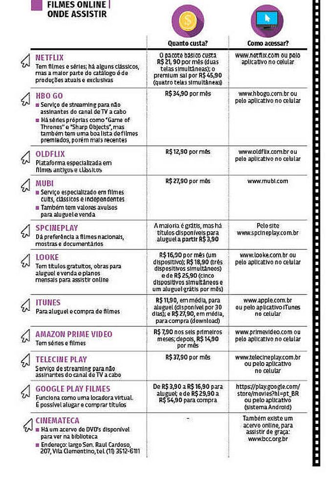 Já o serviço Mubi tem na sua lista clássicos franceses como "O Pequeno Soldado" (1960) e "Uma Mulher é Uma Mulher" (1961), de Jean Luc-Godard. Um dos problemas da plataforma é que nem todo filme possui legenda, mas isso deve ser resolvido até agosto, diz a gerente de marketing do Brasil, Juliana Barbieri.