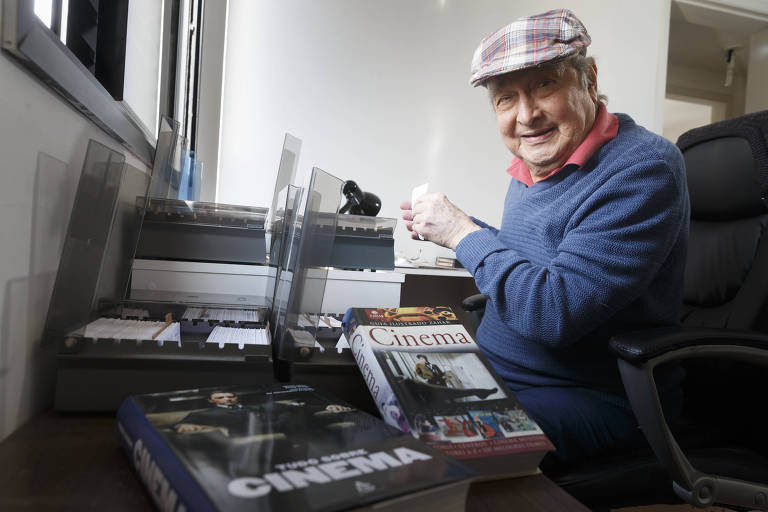 | O arquiteto aposentado Silvio Breno de Souza, 85, fez um arquivo de fichas escrito à mão dos 6 mil títulos que guarda |