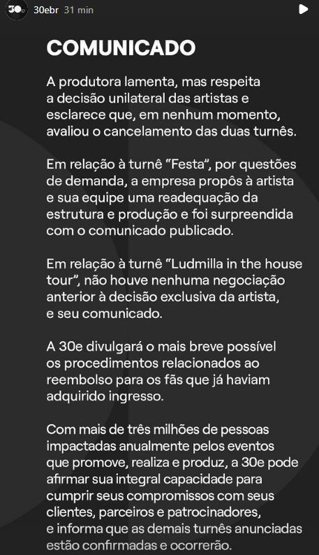 De acordo com a produtora, a empresa chegou a propor à artista e sua equipe uma readequação da estrutura e produção, mas foi surpreendida com o comunicado publicado pelo Staff da cantora baiana.