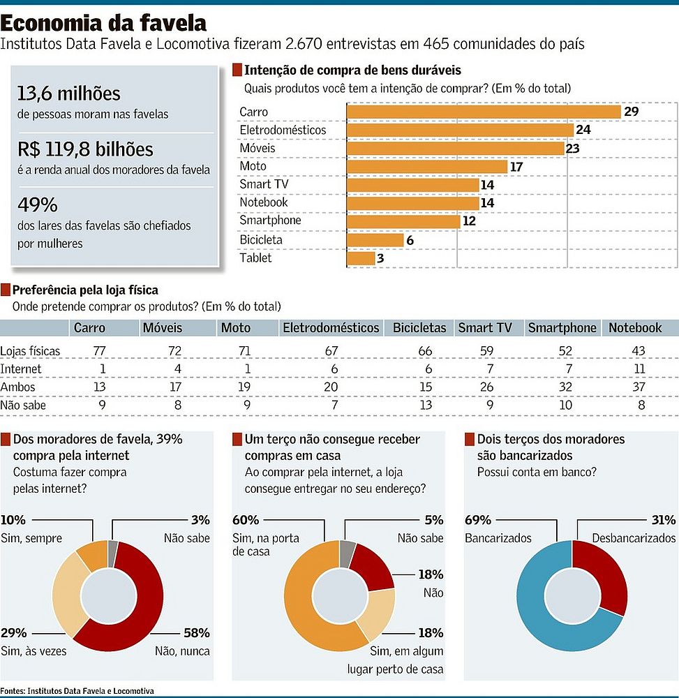 Os moradores das favelas brasileiras reúnem um poder de consumo de R$ 119,8 bilhões por ano, o que supera a massa de rendimento de 20 das 27 unidades da federação do país. É superior, inclusive, ao de países inteiros, como Paraguai, Uruguai e Bolívia. São 13,6 milhões de pessoas em comunidades, com renda domiciliar per capita de R$ 734,10.