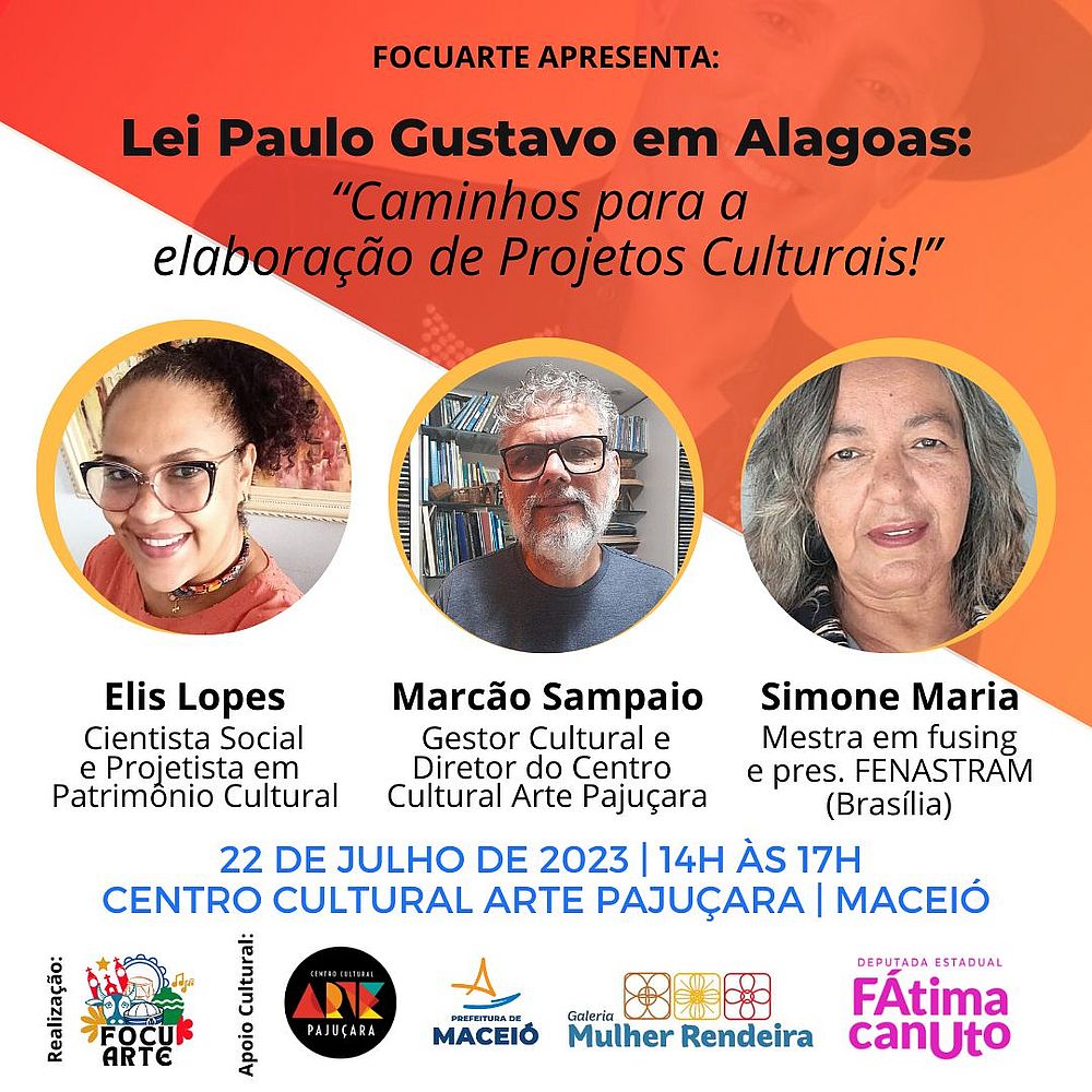 A Federação das Organizações da Cultura Popular e do Artesanato Alagoano (FOCUARTE) realiza no próximo dia 22 de Julho, das 14h às 17h, no Centro Cultural Arte Pajuçara em Maceió a Roda de conversa sobre a Lei Paulo Gustavo com o tema: “Caminho seguro para elaboração de Projetos Culturais!”