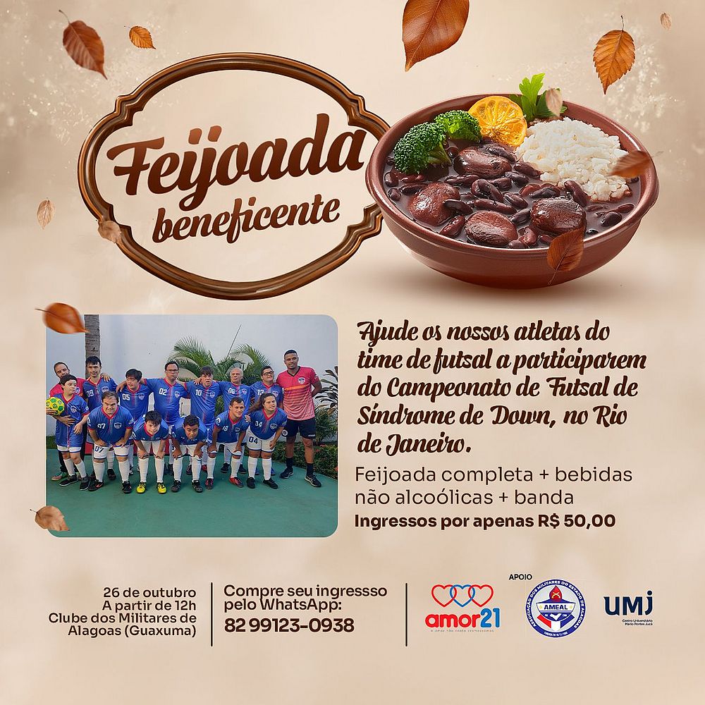Para isso, o Instituto Amor 21 está organizando uma grande feijoada beneficente, onde todo lucro será revertido para essa viagem. O evento acontecerá no próximo dia 26 de outubro, a partir das 12h, no Clube dos Militares de Alagoas, em Guaxuma. Os ingressos custam R$ 50 reais, com direito a feijoada completa, bebida não alcoólica e banda.