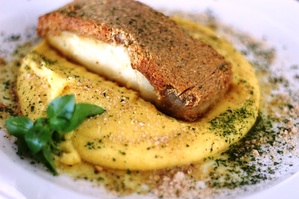 O robalo temperado no sal, preparado no forno com crocante camada de castanha, o que faz toda diferença. Quando chega à mesa, ele está cozido por igual, textura macia e suculenta, simplesmente perfeito. Para acompanhar purê de mandioquinha.