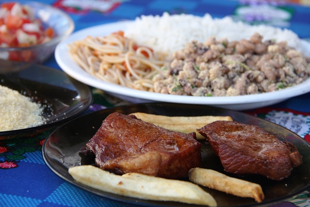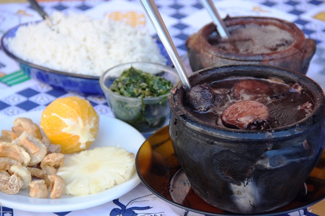 Na panela vão generosos nacos de charque, paio, bacon, pé de porco e linguiça caseira. Numa cumbuca ficam as carnes e na outra o feijão, e noutra área estão disponíveis torresmo, couve, laranja e abacaxi. A porção média serve bem duas pessoas. O corte do charque, dianteiro, também não mudou nessas décadas de trabalho.