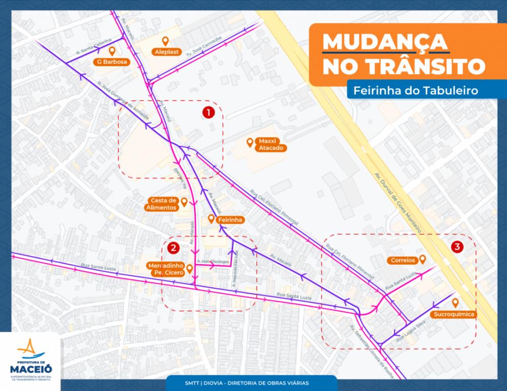 A Avenida Maceió, principal via da Feirinha do Tabuleiro, passará a ter sentido único a partir da praça localizada ao lado da Escola Municipal Pedro Suruagy. O fluxo seguirá até o cruzamento semafórico com a Rua Santa Luzia, onde está localizado o mercadinho Padre Cícero.
