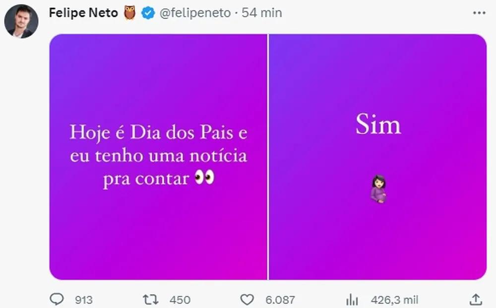 "Hoje é dia dos pais e eu tenho uma notícia para contar", disse Felipe Neto no primeiro post, adicionando um emoji de olhos curiosos, para na sequência publicar: "Sim", e então o emoji da mulher grávida.