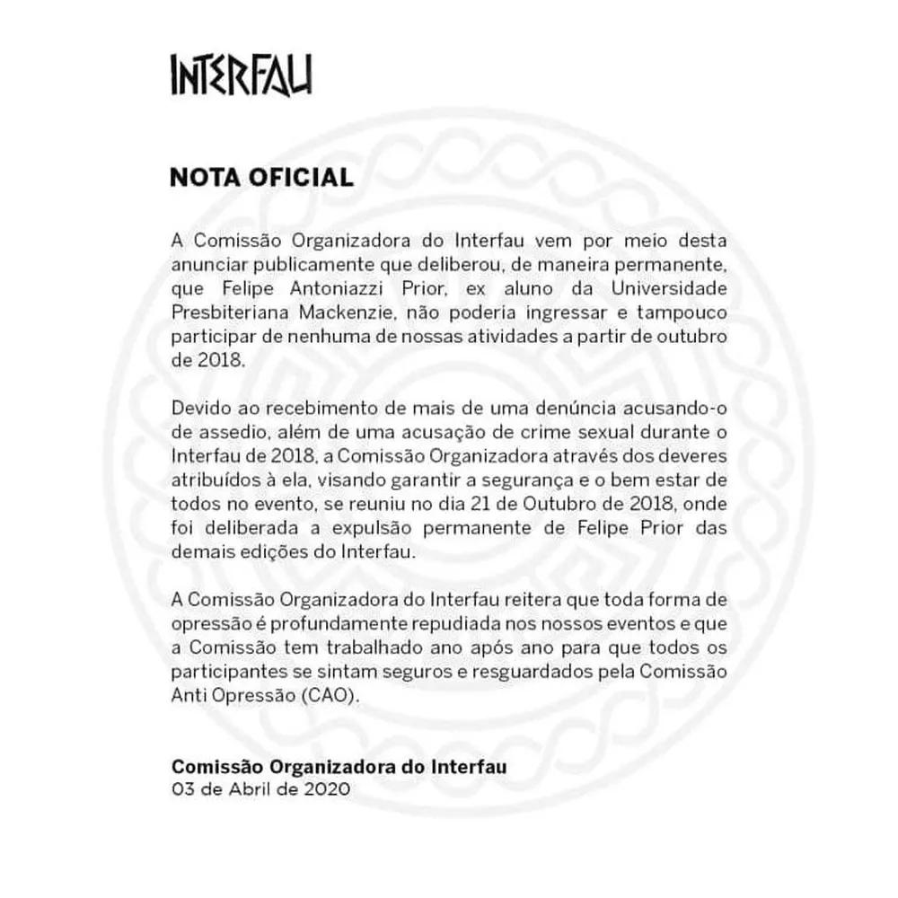 Prior foi expulso do "InterFAU" em 2018, mas como o afastamento só veio a público em 2020, o perfil oficial do evento publicou uma nota no Facebook sobre o caso, confirmando que Prior foi banido após "mais de uma denúncia" de assédio e uma acusação de "crime sexual".
