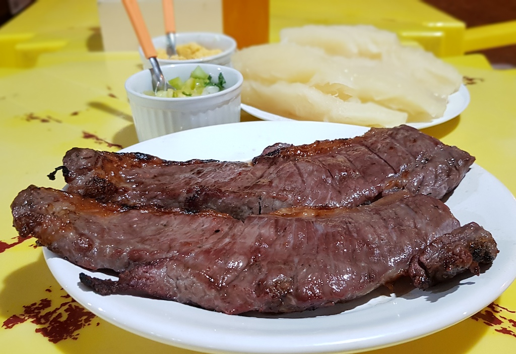Preço: R$ 62,90 (contrafilé matura com macaxeira) para 3 pessoas/ Aceita-se cartões de débito