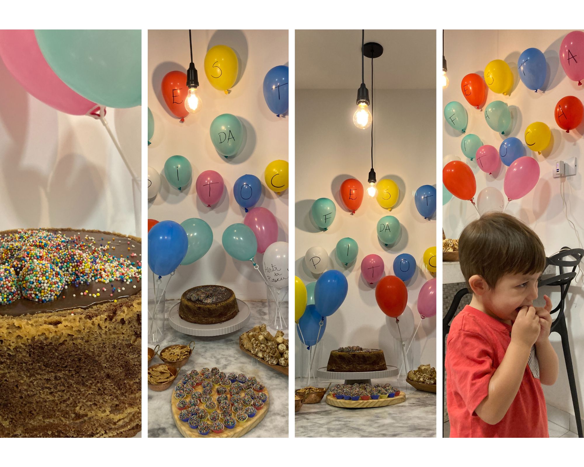 Criamos a festa mais maluca e gostosa de todas. Fiz bolo de chocolate, brigadeiro, salgadinhos, pão de queijo mineiro, pão recheado com calabresa, tudoooo! Enchemos balões, escrevemos um a um com FESTA DA PITOCA e nasceu a celebração como ele queria.