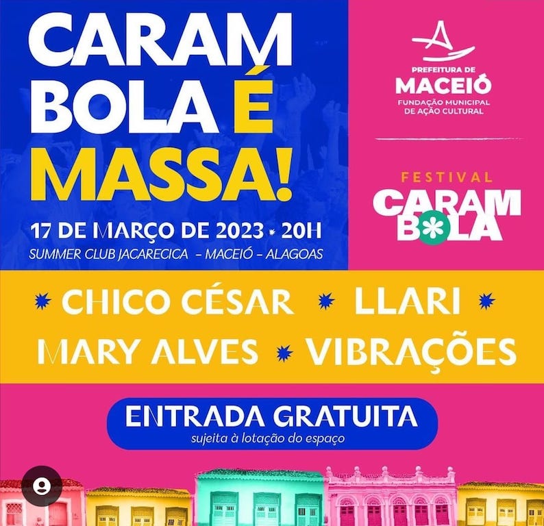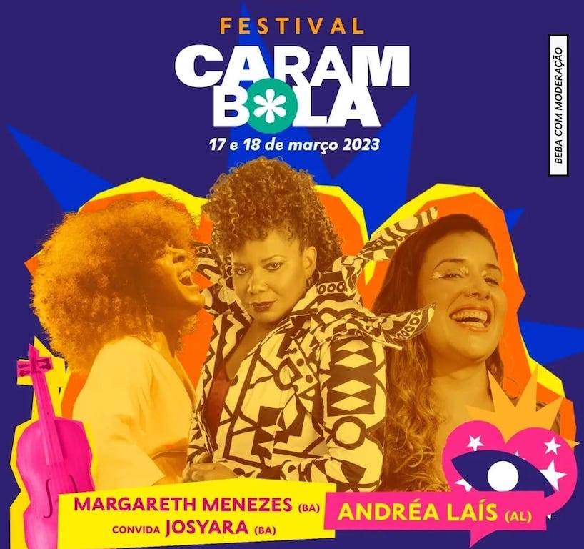 Quem é Festival Carambola: Nasceu em 2017 com o objetivo de valorizar a arte alagoana em suas mais diversas vertentes, com o foco principal na música. Do evento que começou dentro de uma pequena casa de shows em Maceió, atualmente o festival já ocupa parte da área externa de um shopping center na capital alagoana, contabilizando, até 2022, seis edições realizadas. Sua sétima edição acontecerá nos dias 17 e 18 de março de 2023, no Summer Club Jacarecica, Liderado por duas mulheres – a produtora cultural e musicista Lili Buarque e a artista plástica e diretora de arte Didi Magalhães -, o Carambola visa ressaltar a cultura popular alagoana e colocar Maceió de vez no mapa da música independente brasileira da atualidade.