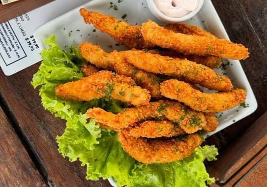 Pier Zero Oito (@pier.zero8): Isca de peixe – tiras de filé de tilápia bem crocantes, empanadas na farinha oriental e acompanhadas do delicioso molho do chef.