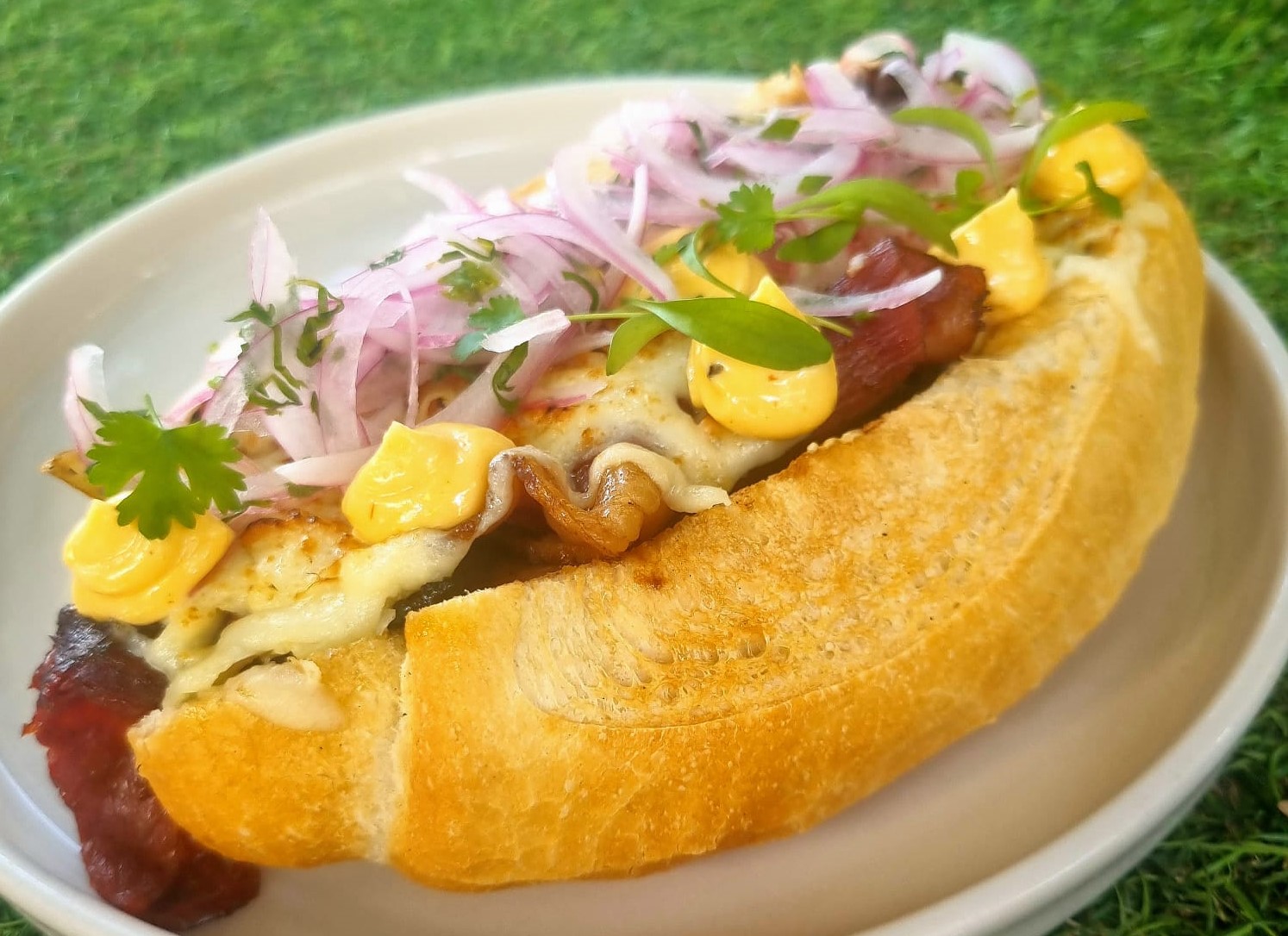Divina Gula (@divinagulabr): Sanduíche “Boquinha de Anjo” – picanha defumada, molho do chef, cebola caramelizada, queijo provolone, maionese de chimichurri e vinagrete de cebola roxa.