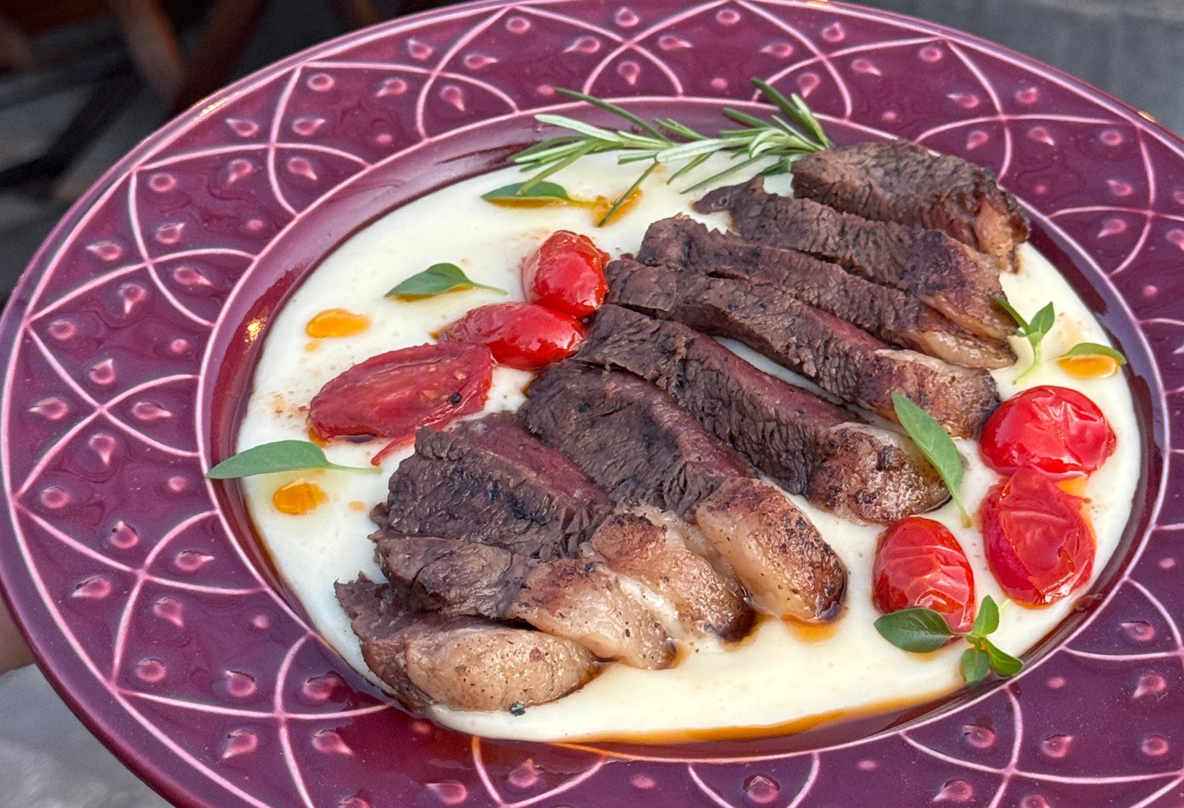 Churrasco do Xosqui (@churrascodoxosqui): Picanha importada fatiada em cama de creme de macaxeira, regada ao azeite aromatizado e tomate-cereja confitado.
