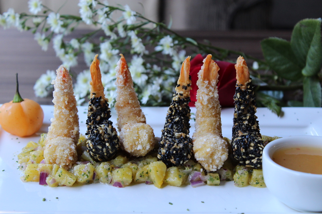 Camarão empanado na tapioca e gergelim, deitado na cama de banana da terra com chutney de abacaxi.