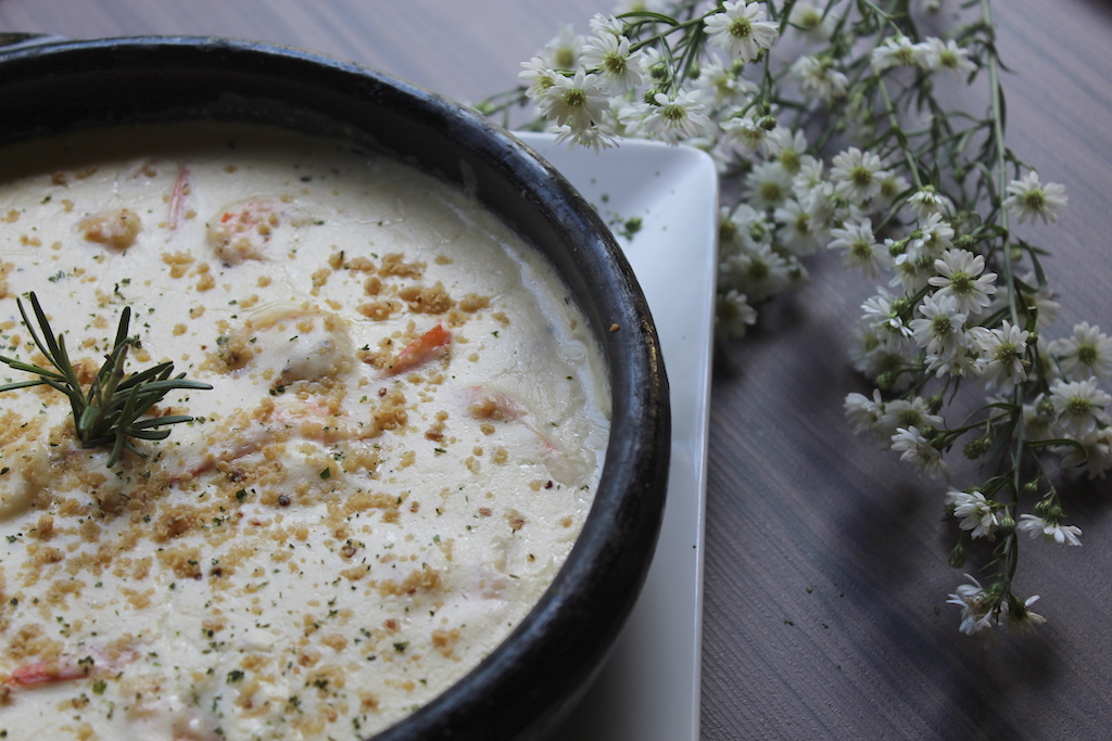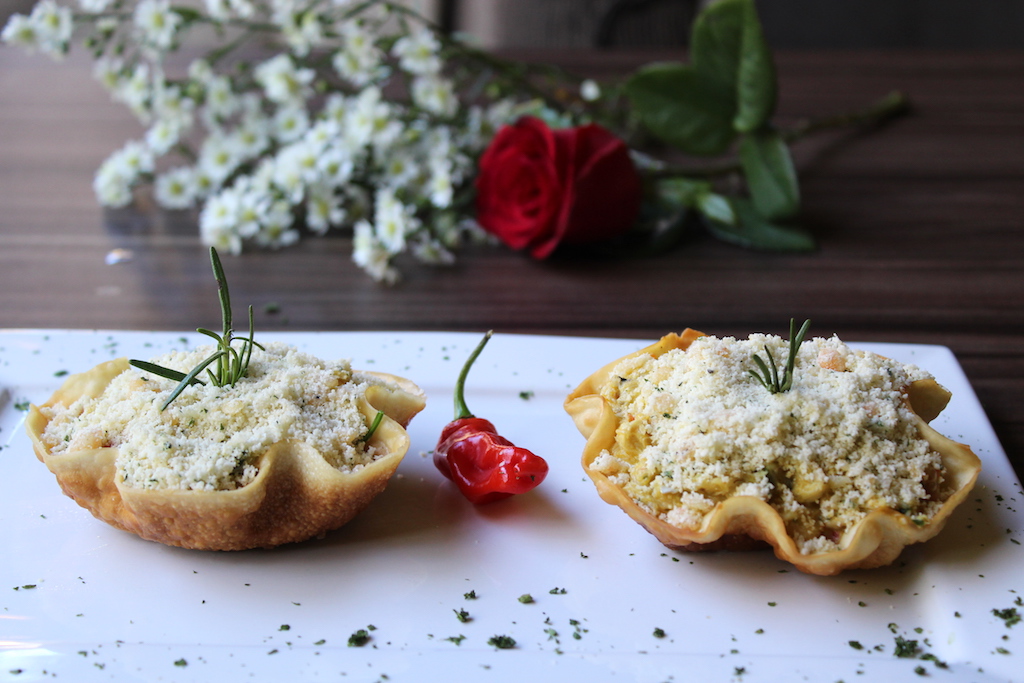 A terceira entrada é a carne de siri com farofa de camarão e alho poró numa cestinha de massa de pastel. E, por fim, camarões orientais, salteados no azeite e regados no molho oriental com toque de ostra.