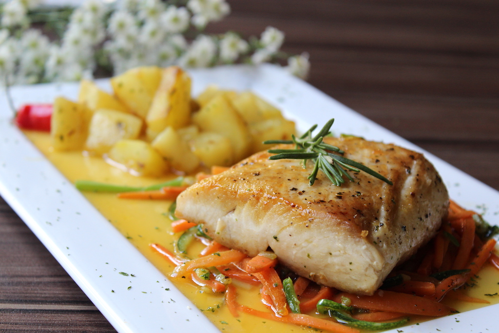 A terceira opção é mais leve. Peixe sobre cama de legumes desfiados, regado ao leve molho cítrico de laranja e, para escoltar, batatas aromatizadas.