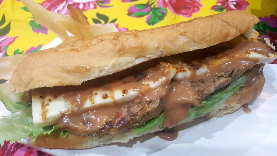 Bom que só: Sanduíche de pão de macaxeira, queijo coalho massaricado, rúcula, alface, molho rústico da Bodega do Sertão e hambúrguer secreto.