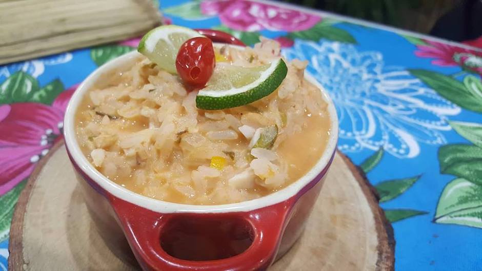 Riso de Tilápia: Arroz cremoso no leite de coco, filé de tilápia e chips de tapioca.