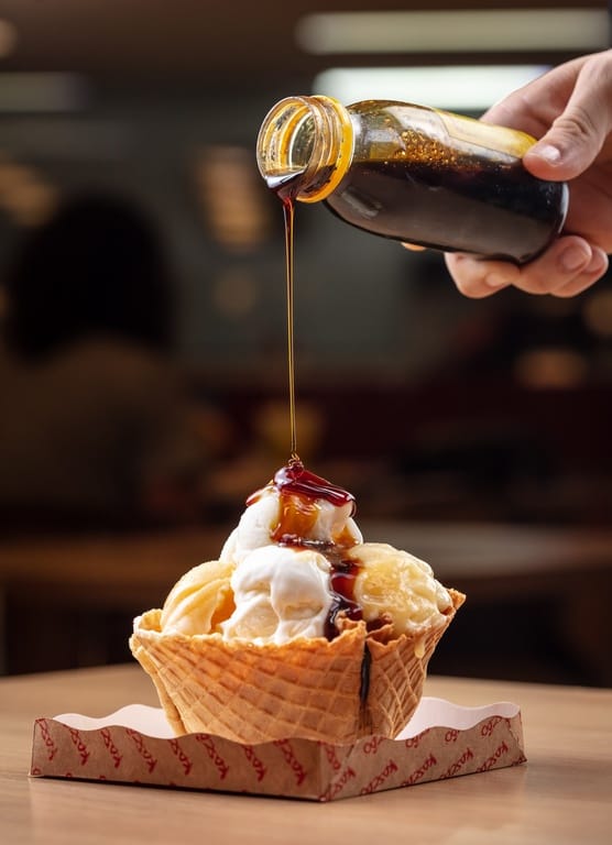 Cestinha de Sorvete Sabores de Alagoas: Biscoito cestinha + mix de sorvetes de coco, tapioca, cajá, milho, graviola, cajú com cobertura mel de engenho e castanha de caju .