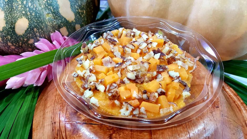 Escondidinho de charque com abóbora e raspa de queijo manteiga: Purê de abóbora com charque salteado na manteiga de garrafa, coberto com raspas de queijo manteiga.