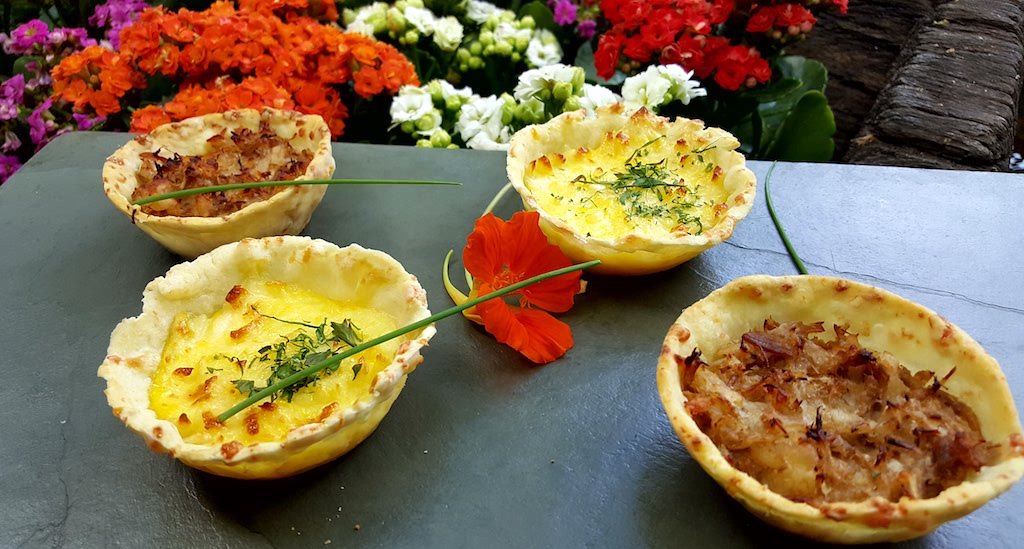 Divina Gula: Trem alagoano são quatro quiches de pão de queijo : duas recheadas com carne de sol e queijo coalho, e mais duas com queijos coalho e parmesão, e ervas.
