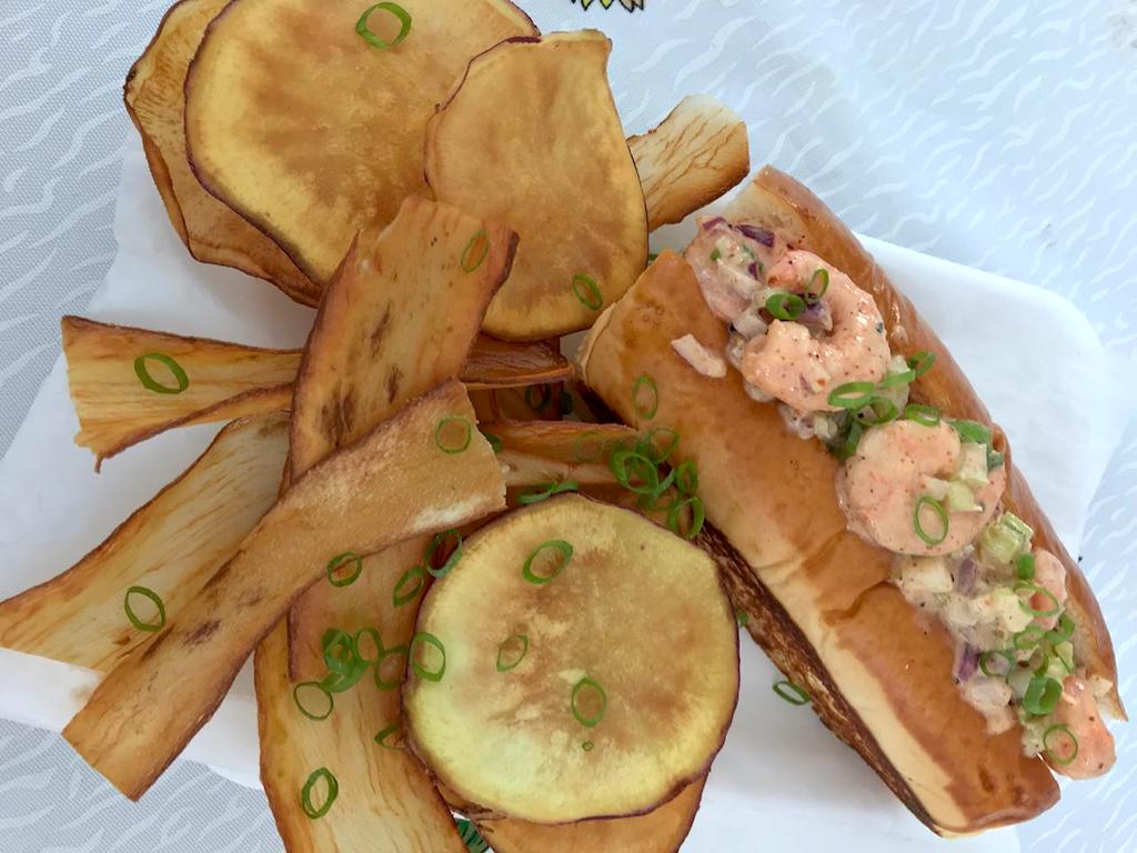 Camarão Roll: Pão brioche recheado com uma maionese de camarão bem acompanhado de chips de raízes.