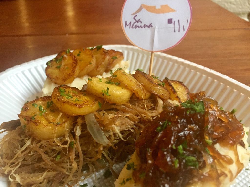 Dueto amostrado: Deliciosa combinação dos sabores da carne de sol com o adocicado da banana na manteiga e purê de batata doce, cobertos com cebolas caramelizadas.