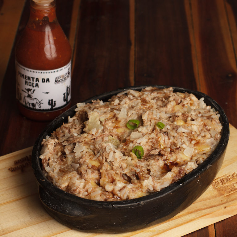 BUDEGA DA MACAXEIRA– Lascado do Carlué uma receita de macaxeira cozida passada na manteiga de garrafa, com cebola roxa e arroz Barão de Penedo, tudo misturado no creme de leite caseiro com tacos de queijo de manteiga, mel de rapadura e lascas de carne seca.