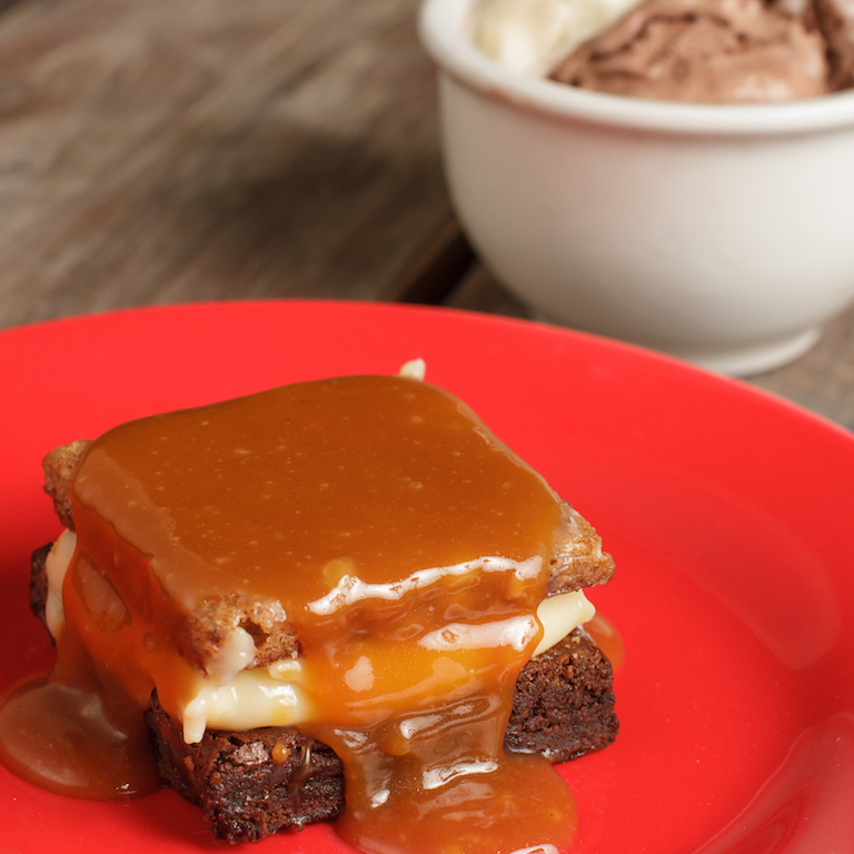 CAKE FACTORY – Brownie desejo vem com recheio de brigadeiro branco e cookies de rapadura acompanhado de uma bola de sorvete de tapioca.