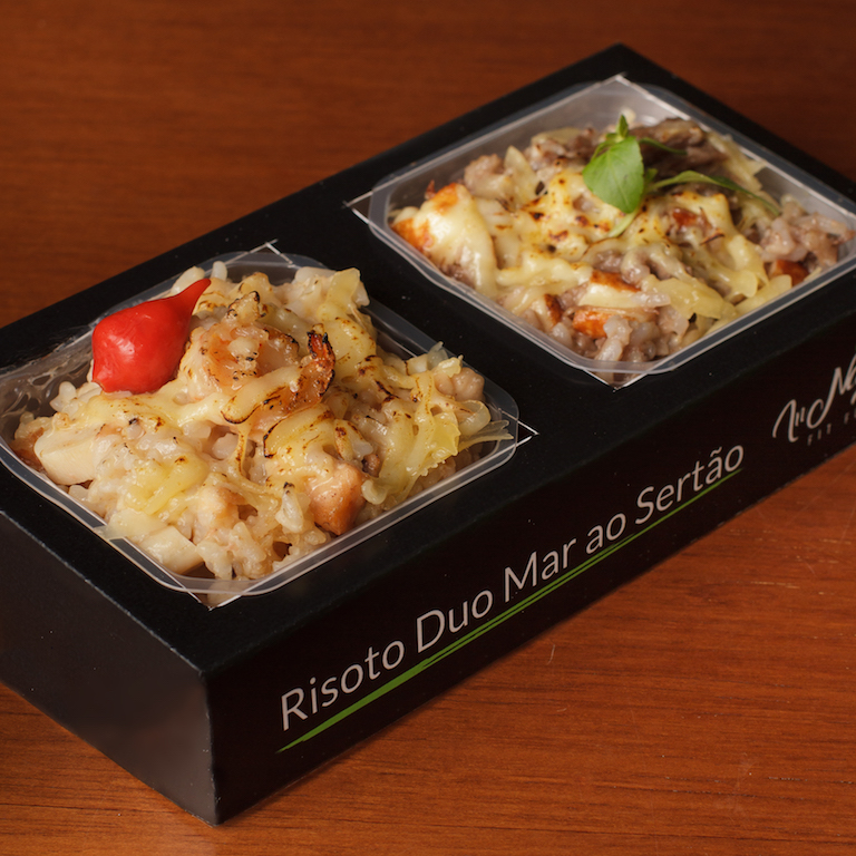 IN NATURA – Risotos duo Mar ao Sertão, sendo um com carne de sol, creme de leite e queijo coalho maçaricado e o segundo é de camarão, polvo, salmão e queijo maçaricado.
