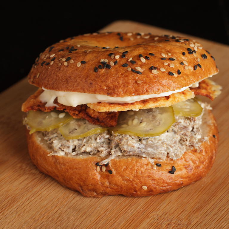 LA DONUTERIA – Oxe Feeling, um delicioso bagel (pão em forma de anel) de carne de sol na nata, picles de maxixe, maionese de macaxeira e crocante de queijo coalho.