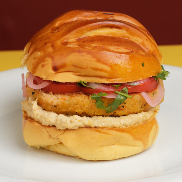 MONTAGUS – Hambúrguer de camarão com maionese de siri, bacon crocante e salada no pão brioche.