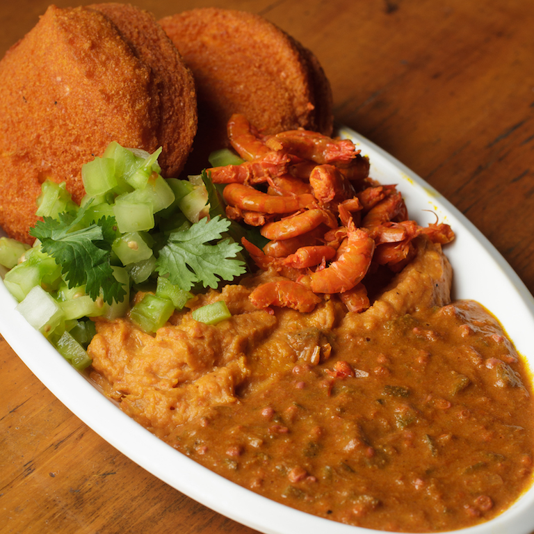NANA BAIANA – Acarajé preparado com feijão fradinho temperado com cebola e alho frito no dendê, recheio de vatapá, camarão e salada.