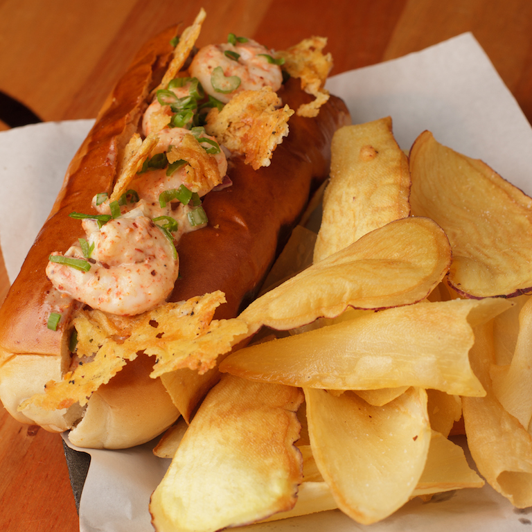 NÔMADE – Camarão matuto é o sanduíche com o crustáceo no pão brioche polvilhado com crocante de queijo manteiga, acompanhado de chips de macaxeira e batata doce.
