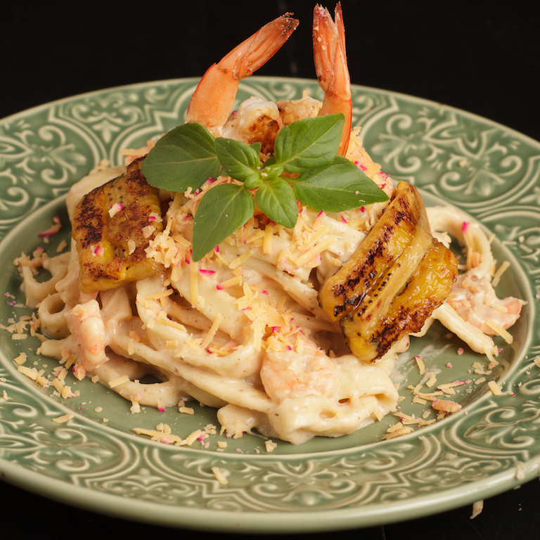 SANTA MASSA– Talharim do Reino é uma massa artesanal, acompanhada de camarões flambados ao molho misto e banana da terra salteada na manteiga de ervas com queijo do reino maçaricado.