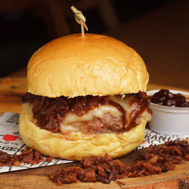 SPORTS BURGER – Burger arretado é o hambúrguer 100% fraldinha com barbecue de rapadura com queijo manteiga e chips de macaxeira.