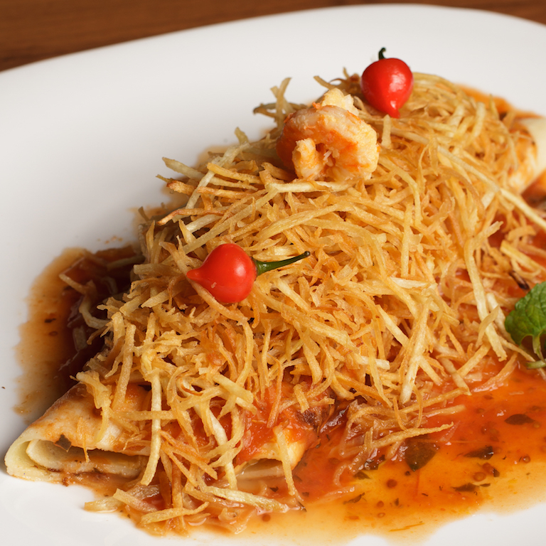 SUECA COMEDORIA – Camarão arretado é uma receita do crustáceo no molho de tomate envolto em uma deliciosa e fina massa de panqueca finalizada com palha de batata doce.