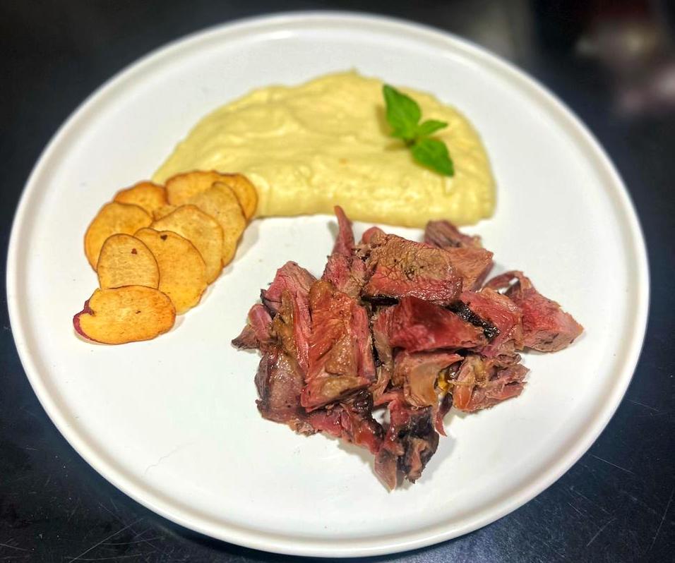 FIKA BBQ – Carneiro Arretado: Pernil de carneiro defumado em lenha frutífera, com creme de macaxeira e chips de batata doce.