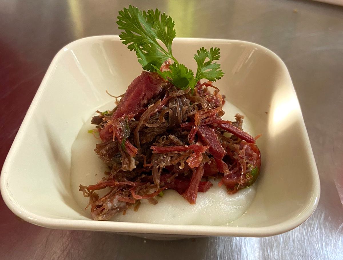 DELÍCIAS ALAGOANAS: Musseline das Alagoas com mix do Sertão crocante, com creme de massa puba (mingau pitinga) com charque e calabresa salteado nos pimentões coloridos e chips de raiz.